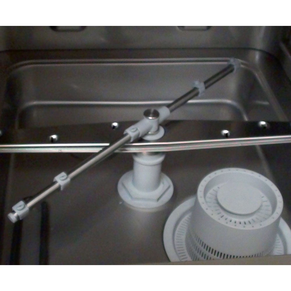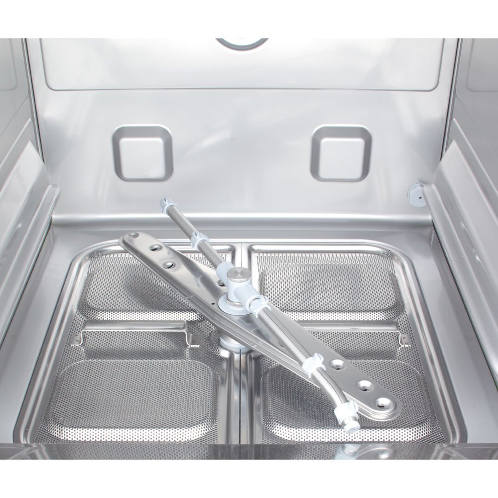 Réalisation : en double parois entièrement en acier inox AISI 304. Bras de lavage et rinçage (supérieur et inférieur), rotatifs, (inferieurs en acier inox). Gicleurs en acier inox auto-nettoyant. Cuve emboutie intégralement (8 lt – 0,6 kW). Coulisses panier embouties, pas d’aspérité et pas d’incrustation de calcaire. Filtre en cuve « intégral », en acier inox « moulé ». Filtre pompe « breveté » permettant de conserver l’eau de lavage plus longtemps et à la bonne température. Porte emboutie double parois, joint d’étanchéité de la porte amovible, poignée emboutie. Vérins réglables. Panneau de commandes extractible, facilitant le service après-vente.